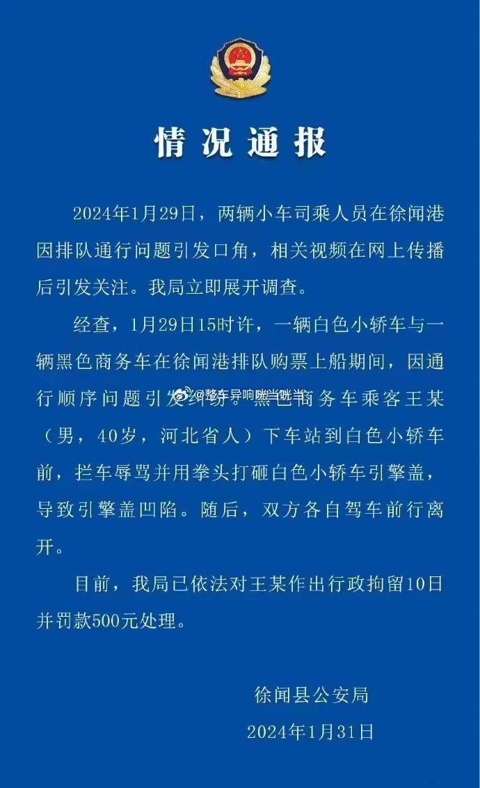31日下午,广东湛江徐闻县公安局发布通报,核心3点:1、该男子已经被行政拘留;2、通行顺序问题引发纠纷(但没有定性说到底谁插队);3、王某拦车、辱骂和砸车,事实清晰。