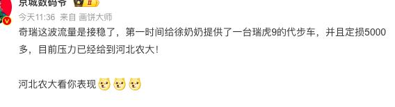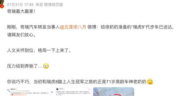 同日,@奇瑞汽车客服 发布短视频称:奇瑞工作人员慰问徐奶奶,并提供瑞虎9代步车。我们的车主奶奶,我们自己宠。