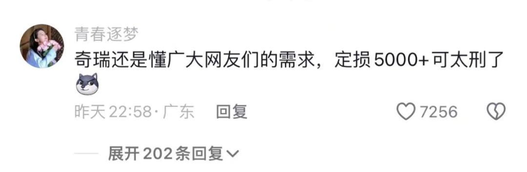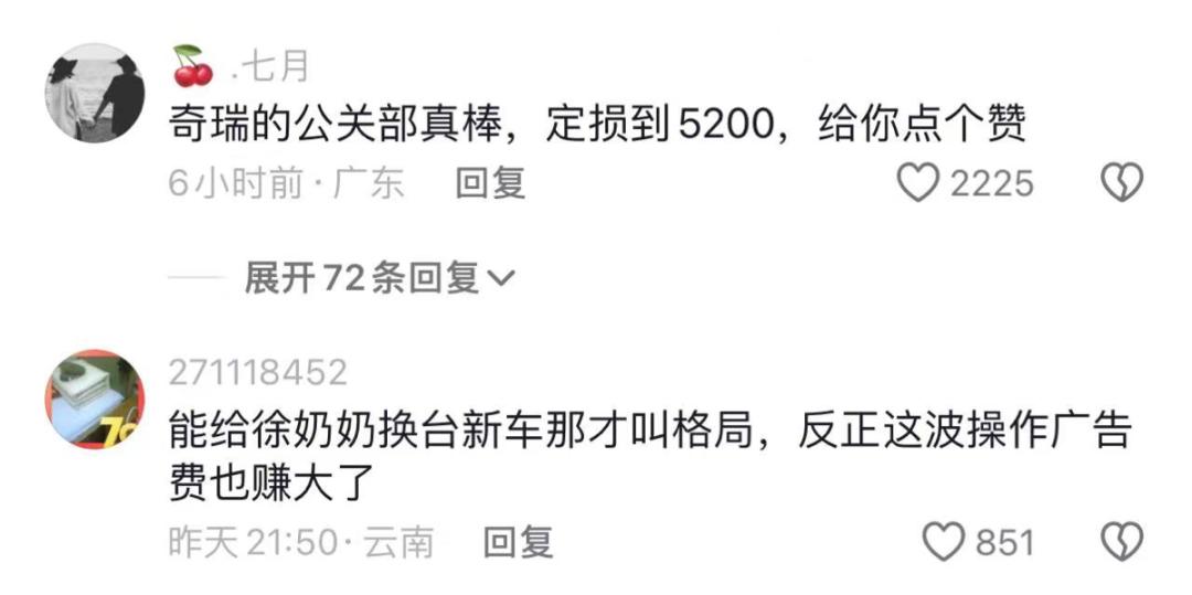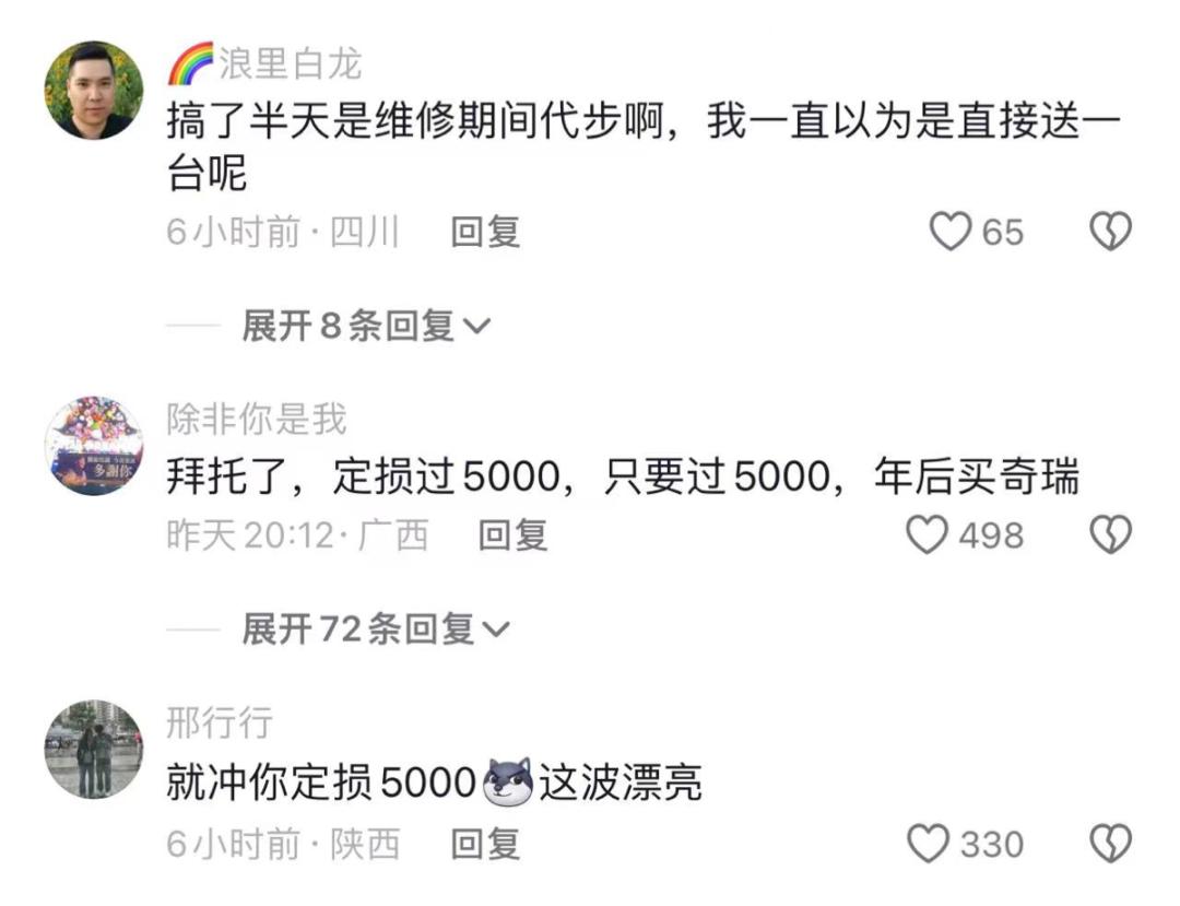 在这个案例中,不少网友在奇瑞抖音下面留言说:要求给被砸的那辆车定损在5000,给奔驰车主一点颜色看看。结果,奇瑞听劝的,真的定损在5000块。