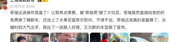 大叔经常说,借势好于造势,因为造势太难了,借呢,最考验的就是快速和姿势。这个事情之前,网红奶奶开奇瑞,估计知道的人很少,但这次完全出圈了。奇瑞这波快速借势,是懂流量的!