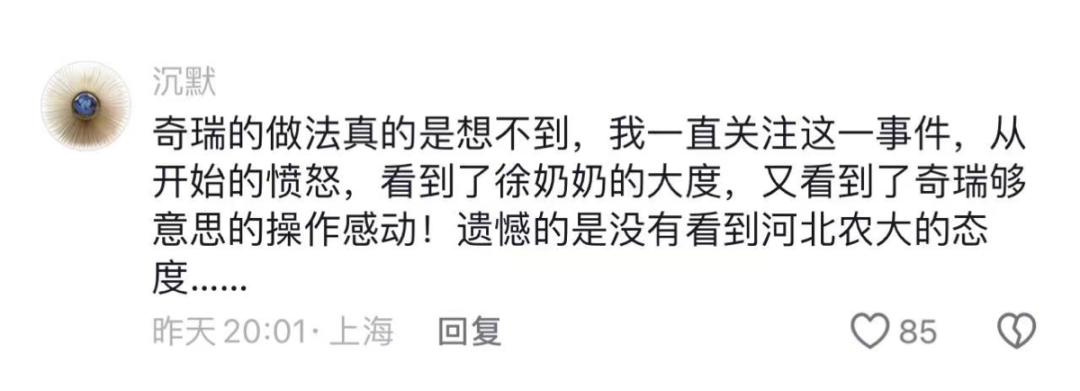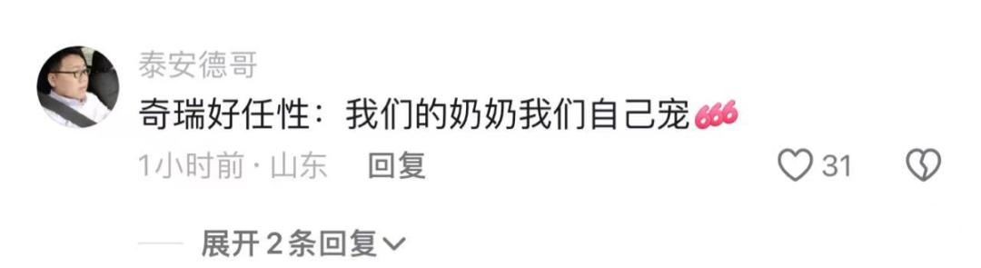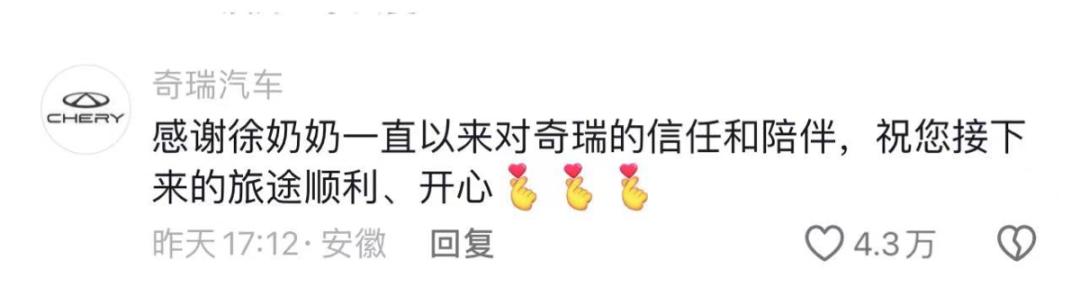 @奇瑞汽车 抖音大号不仅同步转发,还专门在奶奶视频下留言。