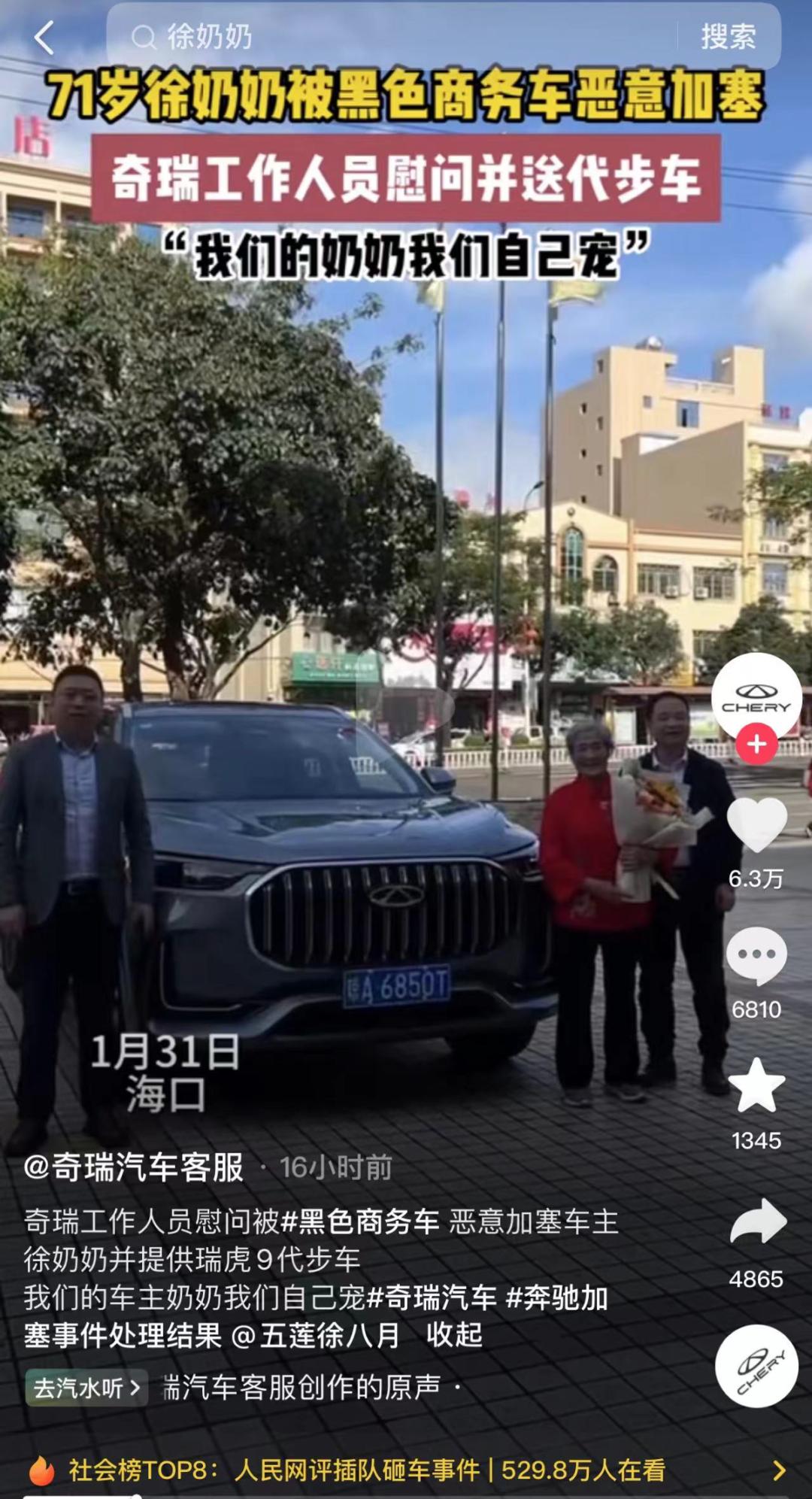 因此,在网红奶奶发布相关短视频之后,又专门去了海口奇瑞4s店定损修车,24小时之内,奇瑞汽车很快启动相关方案,安排人去慰问和送车。