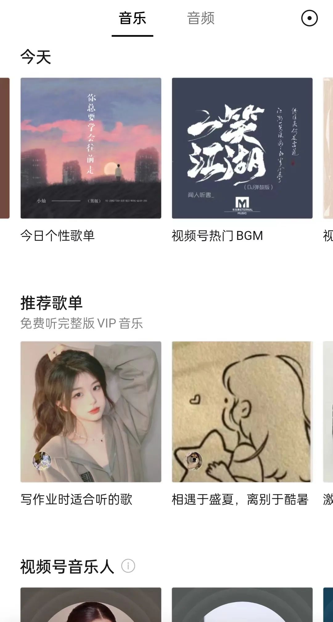 其中“音乐”更像是个精简版的QQ音乐,由 “今天”、“最近听过”、“推荐歌单”、“视频号音乐人” 等板块组成。