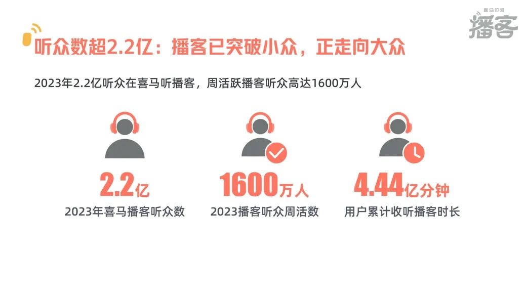 《2023喜马拉雅中文播客生态报告》显示,2023年在喜马拉雅等平台扶持和助推下,中文播客不再囿于小众圈层,正一步步向大众群体扩展;中文播客听众数超过2.2亿人,播客成为内容创作新蓝海;有50.2%的播客听众曾为播客内容付费,播客的商业化形式正日渐多元。