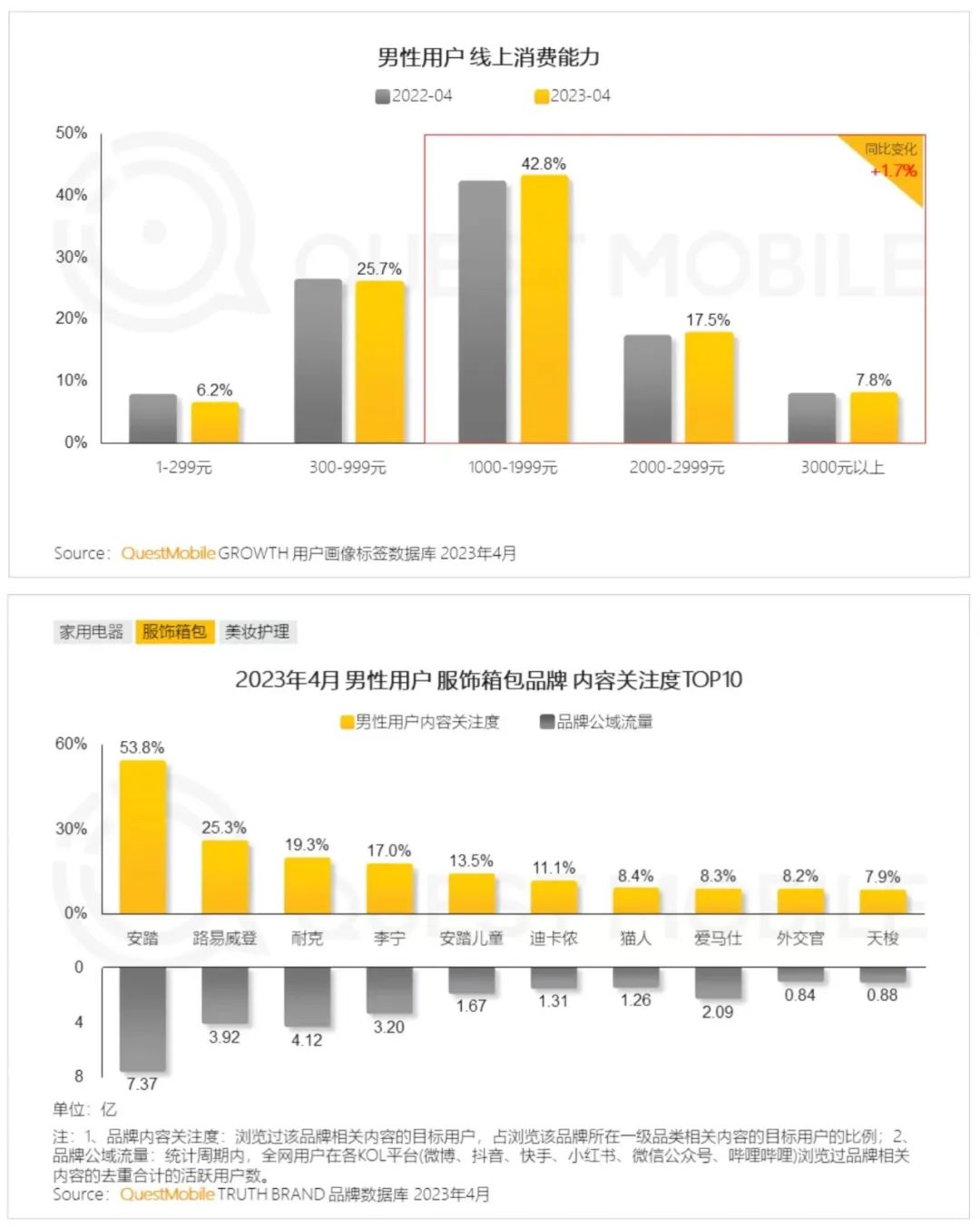 QuestMobile2023男性消费洞察报告指出,男性释放出更强的购买力,线上消费能力达到千元以上的用户比例明显增长。同时,男性用户对国产运动品牌有较高的关注度,并且随着男性时尚意识的觉醒,男装品牌越来越注重数字化营销。
