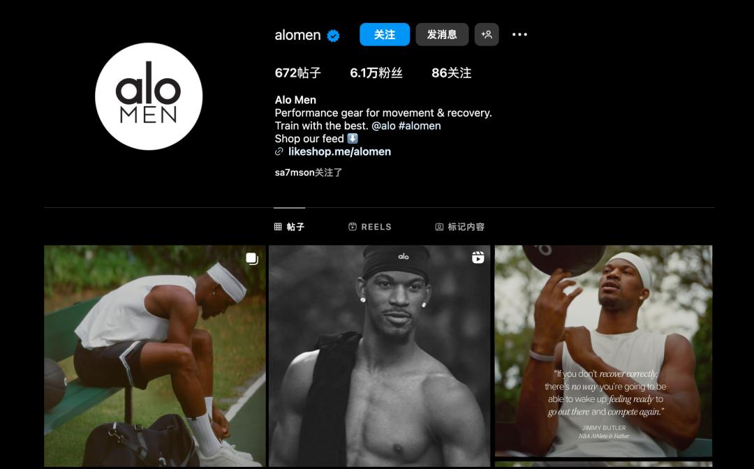同样是做女性瑜伽服起家的 Alo Yoga 也已经开始布局自家的男装业务线。在其官网可以看到,目前已经有设置单独的 Alo Men 商品标签页。Alo Men 的官方Instagram账号也已经累计有超过6万粉丝。