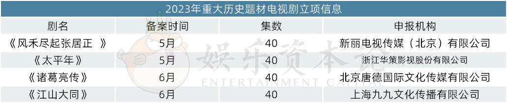 值得一提的是,2023年的五至六月,通过4部重大历史题材电视剧。而2022年与2021年分别仅有一部重大历史题材电视剧立项,2023明显远超前两年的立项备案数。