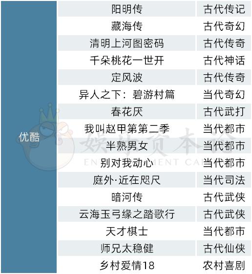 优酷延续其在古装领域的稳定优势,着重布局《阳明传》《藏海传》《清明上河图密码》《定风波》《春花厌》《暗河传》等头部古装IP改编作品。同时,基于《少年歌行》和《异人之下》在2023年的口碑人气双丰收,真人漫改有望成为优酷特色的剧集赛道。2023年,优酷备案《异人之下:碧游村篇》,该剧由《异人之下》原班人马打造,文淇加入主演,或将见证优酷深掘自身的前瞻性视野。