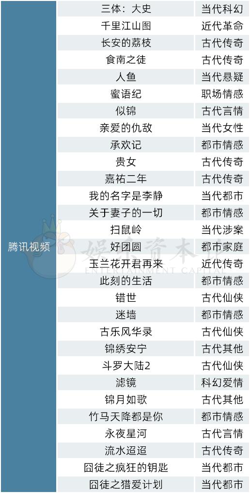 据不完全统计,腾讯视频出品的备案项目领跑其他平台。根据表格数据,腾讯视频秉持着类型多元化方针,在古装、都市、仙侠、科幻、涉案题材赛道均有涉猎,且注重严肃文学的IP改编,而这毫无疑问得益于腾讯视频旗下的阅文集团。