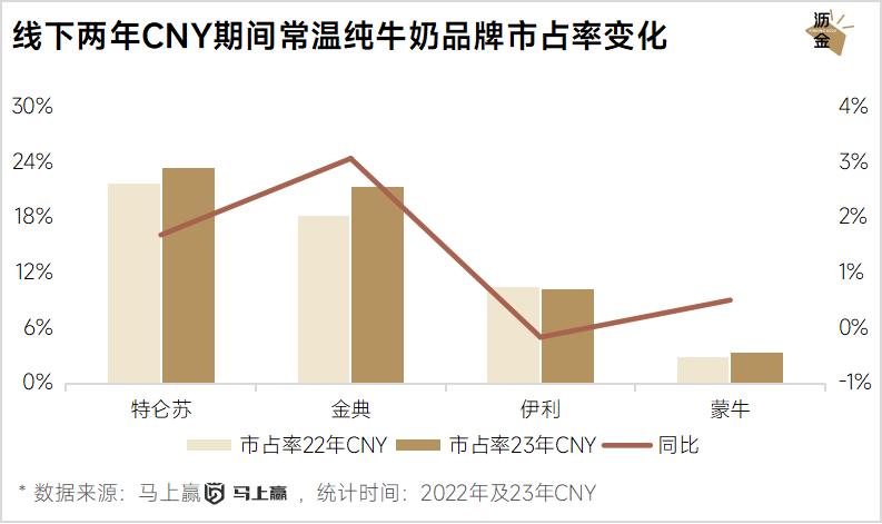 其中,特仑苏、金典分别是蒙牛、伊利的高端品牌,在CNY期间高端品牌的礼赠属性强,市占率大且增速快。