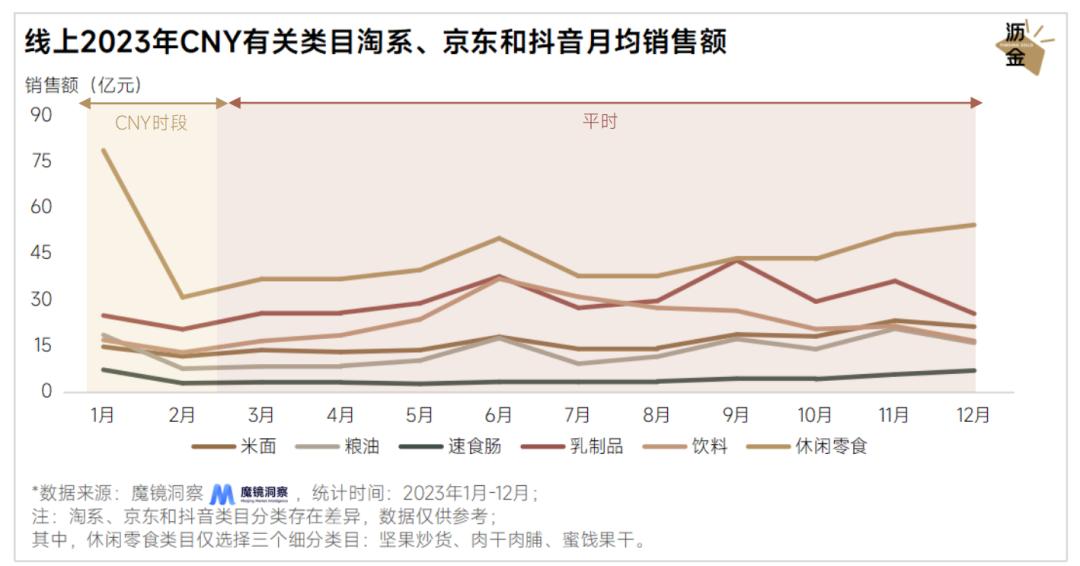其中,淘系是休闲零食的主战场,2023年CNY期间销售额超50亿元;抖音增速最快,销售额同比大涨80.6%。