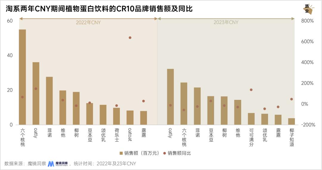 淘系两年CNY期间植物蛋白饮的CR10品牌销售额及同比