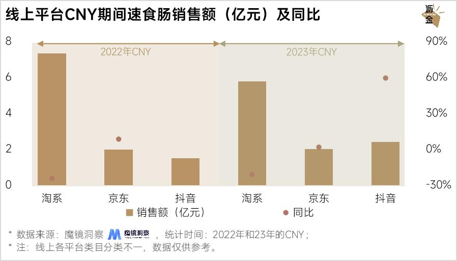 先看线上,CNY期间,速食肠连续两年在淘系、京东、抖音卖了10个亿,销售额同比在京东、抖音均有增长。