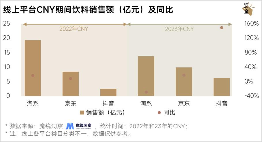 线上三大主流电商平台中,京东和抖音的饮料销售额同比都呈现稳步上升态势,其中抖音同比大涨149.10%,增速最快。