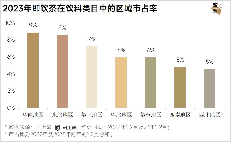 从地区销售来看,华南、东北地区市占率领跑全国。这可能是因为华南地区茶文化历史悠长、受众广,而东北地区正处于集中供暖时期,润燥解渴的即饮茶更受青睐。