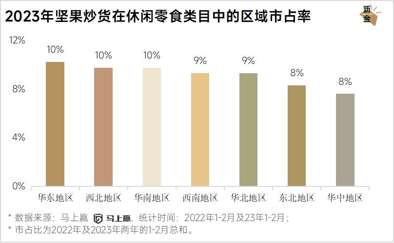 2023年坚果炒货在休闲零食类目中的区域市占率