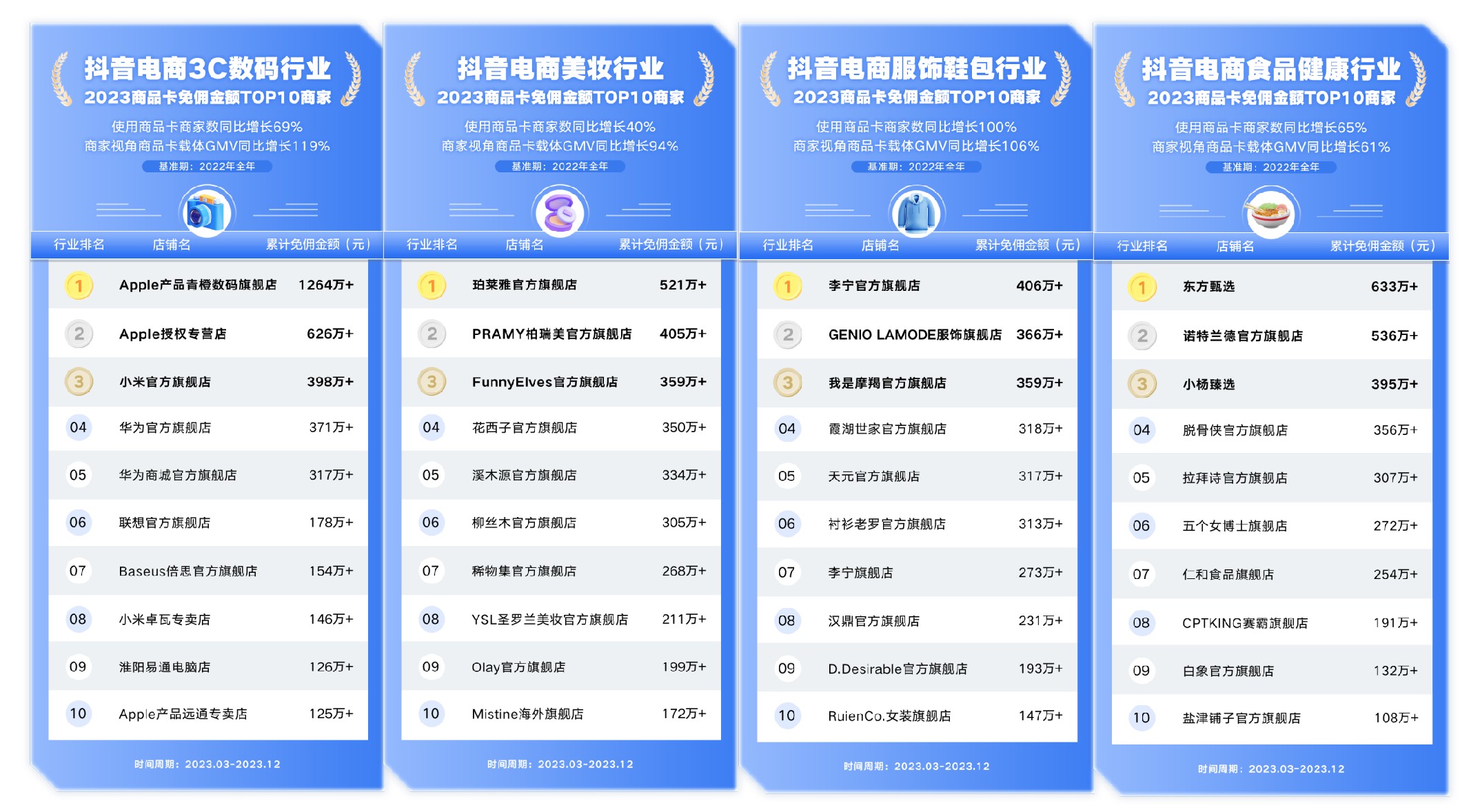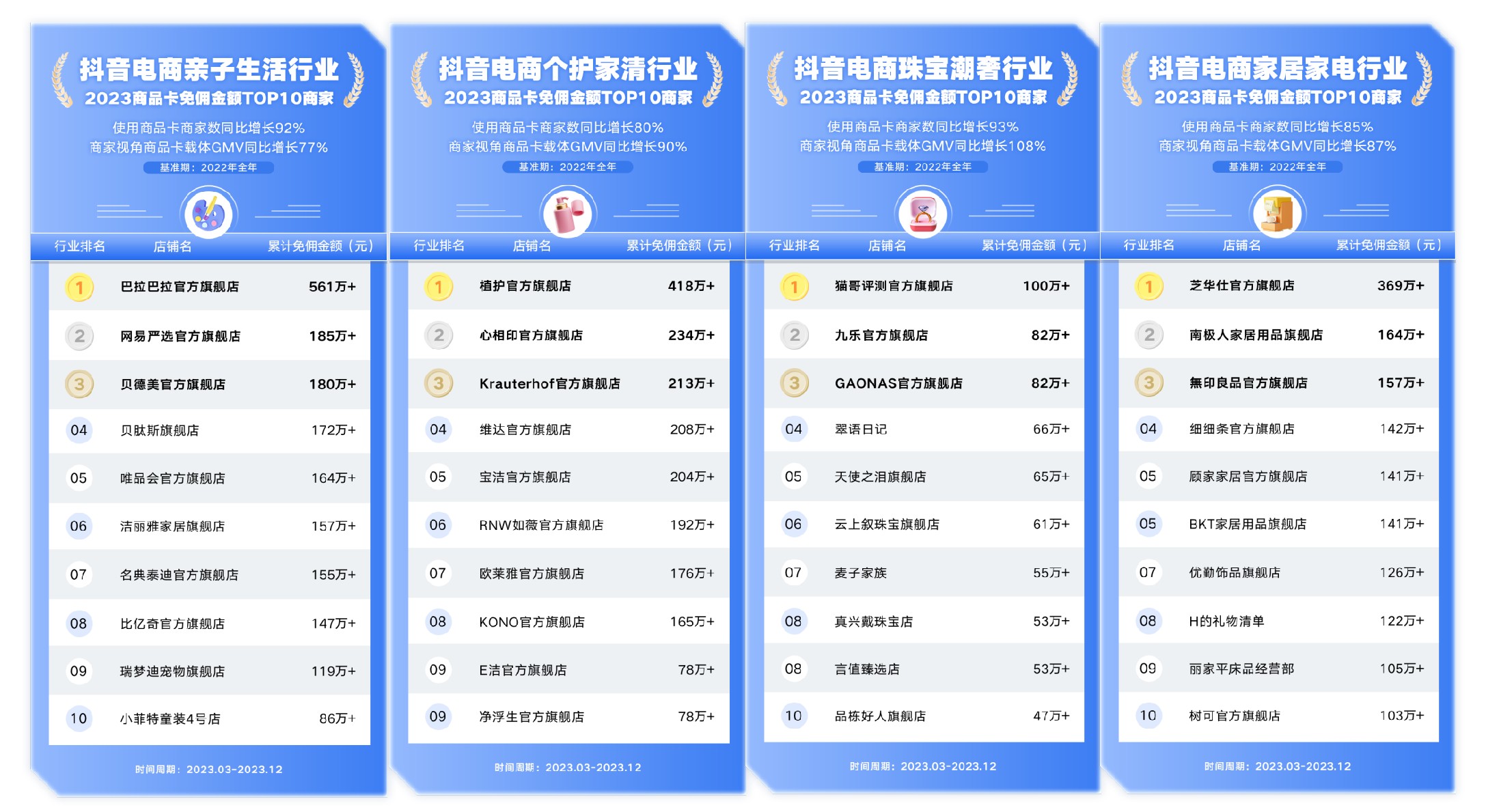 年终之际,抖音电商聚焦3C数码、美妆、服饰鞋包、食品健康、亲子生活、个护家清、珠宝潮奢、家居家电等多个行业,复盘商品卡免佣成绩,筛选出各行业商品卡免佣金额TOP10商家,树立经营标杆。
