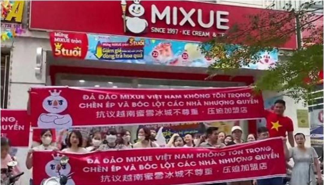 比如去年9月,蜜雪冰城的越南加盟商集体拉横幅集体抗议。起因是蜜雪冰城宣布在越南产品降价25%,但供应给加盟商的原料却只降低8%-10%,这意味着加盟商需要承担较大的调价损失。