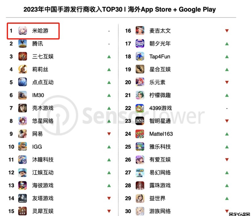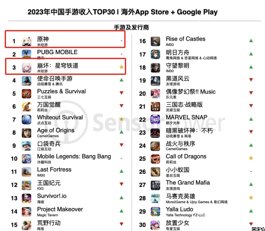 1月29日,Sensor Tower公布的榜单数据显示,《原神》已连续第三年蝉联国内手游出海收入冠军宝座。再加上《崩坏:星穹铁道》的爆火,米哈游力压腾讯,成为了2023年中国手游发行商海外收入榜的TOP1。