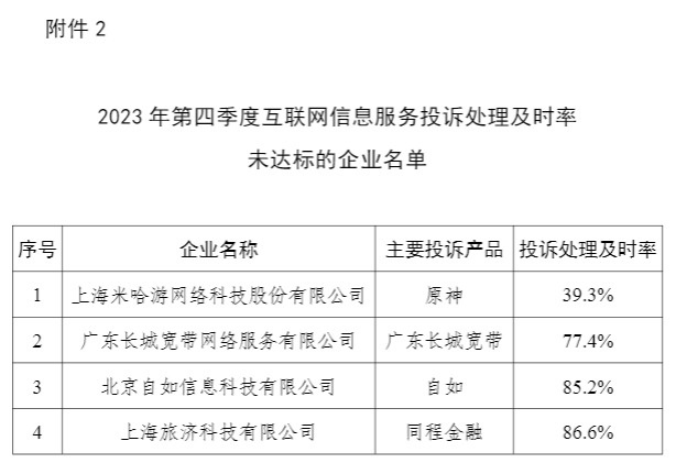 在接入工信部平台的175家互联网企业中,仅有米哈游等4家因上述原因被点名,其中又以米哈游的39.3%投诉处理及时率数据为垫底。