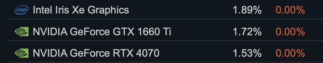 尽管英伟达正不遗余力地推出新显卡,并用 DLSS 这种近乎「作弊」的方式来展现显卡的帧数提升。但从消费者的购买意愿来看,英伟达的新显卡似乎还缺了些诚意。从 Steam 的游戏玩家硬件统计来看,2023 年 12 月最多玩家使用的显卡还是发布于 2023 年 2 月的「甜品级」RTX 3060 显卡,整个 40 系中只有 RTX 4060 移动版的用户占比超越了英特尔的 Iris Xe 核显。
