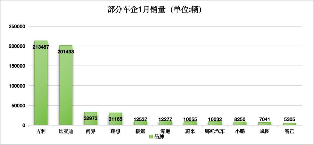 事实上,2024年1月,上演“反转”剧情的不只理想与问界。企业公开数据显示,同月,吉利汽车以213487辆的单月成绩超过2023年全国销量榜冠军的比亚迪;极氪则跑赢了领跑和蔚来汽车;小鹏汽车则较“新势力三兄弟”中的理想、蔚来差距越来越大,单月总交付量仅为8250辆。