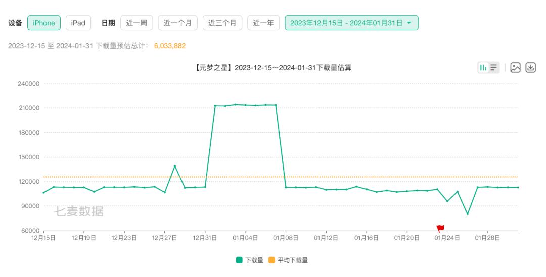 七麦数据显示,《元梦之星》的iPhone端下载量在正式上线后的一个月内,经历了从上线首日10.6万到21.4万峰值的暴涨。特别是在1月1日到1月7日的一周内,《元梦之星》iPhone端下载量连续7天保持在21万以上。