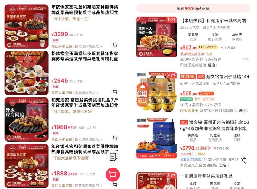 比如和苑酒家最贵的一款“钟鼎家宴套餐”在天猫上售价3299元,招财金鲍大盆菜(7斤)京东到手价预估3744元,一哥鲍鱼的“大富大贵”佛跳墙盆菜京东到手价预估3999元;售价松鹤楼的“金玉满堂年夜饭套餐”的天猫售价2545元,大董佛跳墙年夜饭家宴天猫售价1888元……