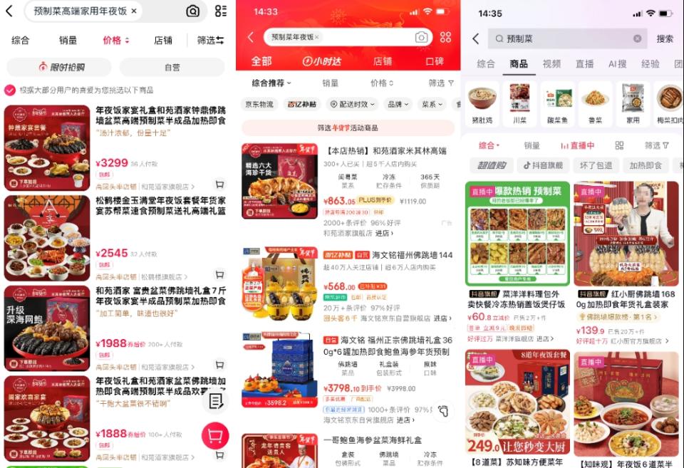 手机上,打开天猫搜索“预制菜高端家用年夜饭”,品类多达4254件;京东上搜索“预制菜年夜饭”的品类也多达2800多件;抖音电商推售的各种预制菜产品也是品类繁多……