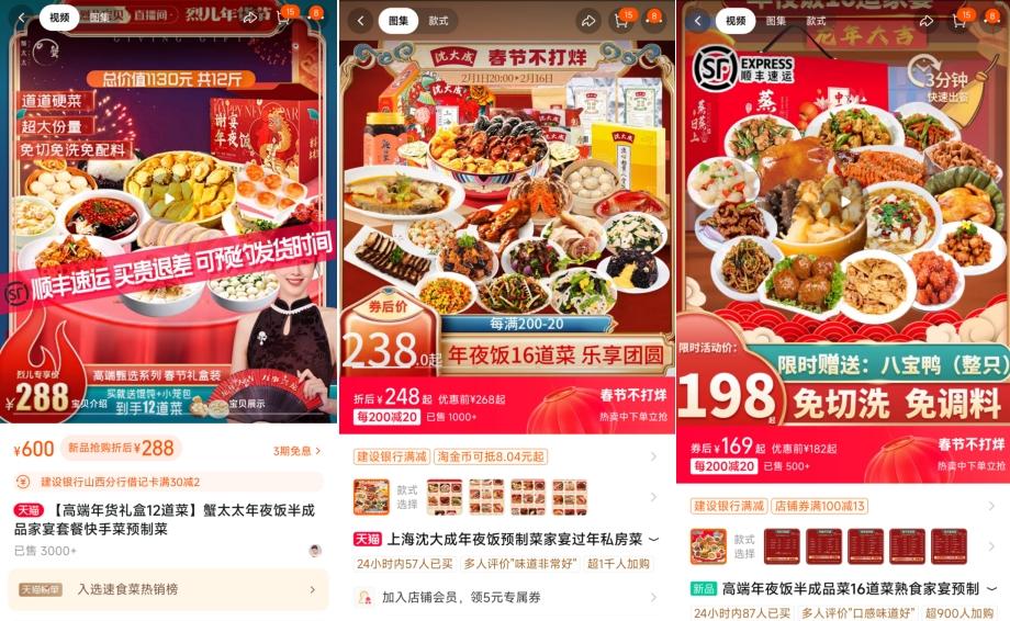 或许是价格门槛影响了“发挥”,当价格下探到398元后,味必然食品旗舰店推出的包含16道菜的年夜饭套餐在天猫上有超过3000人购买。