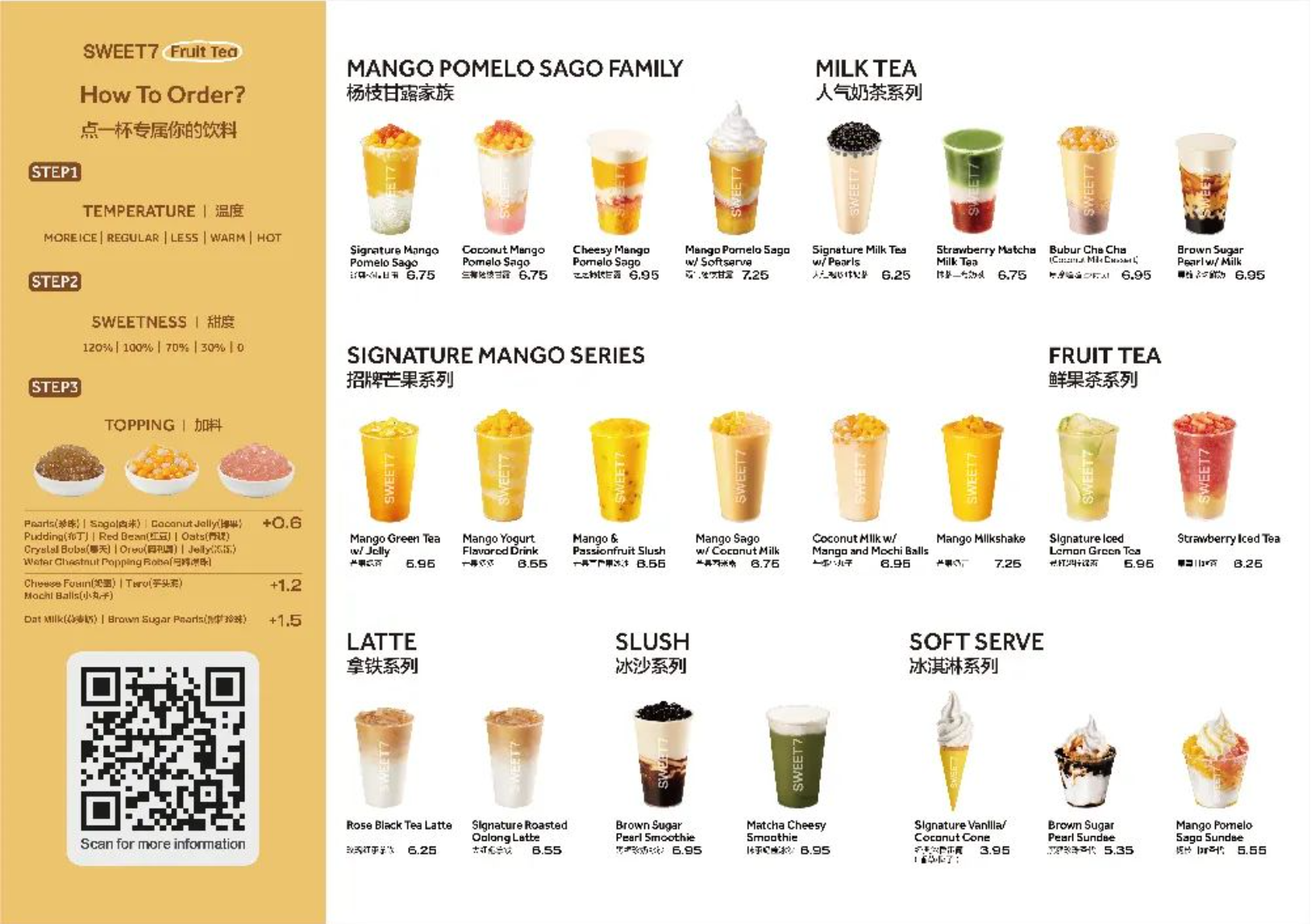 七分甜选择北美市场市场切入,菜单显示,核心大单品杨枝甘露家族定价基本在6.75至7.25加元之间,相对高端,作为参考,加拿大国民咖啡品牌Tims Hortons的饮品定价基本在1-4加元。