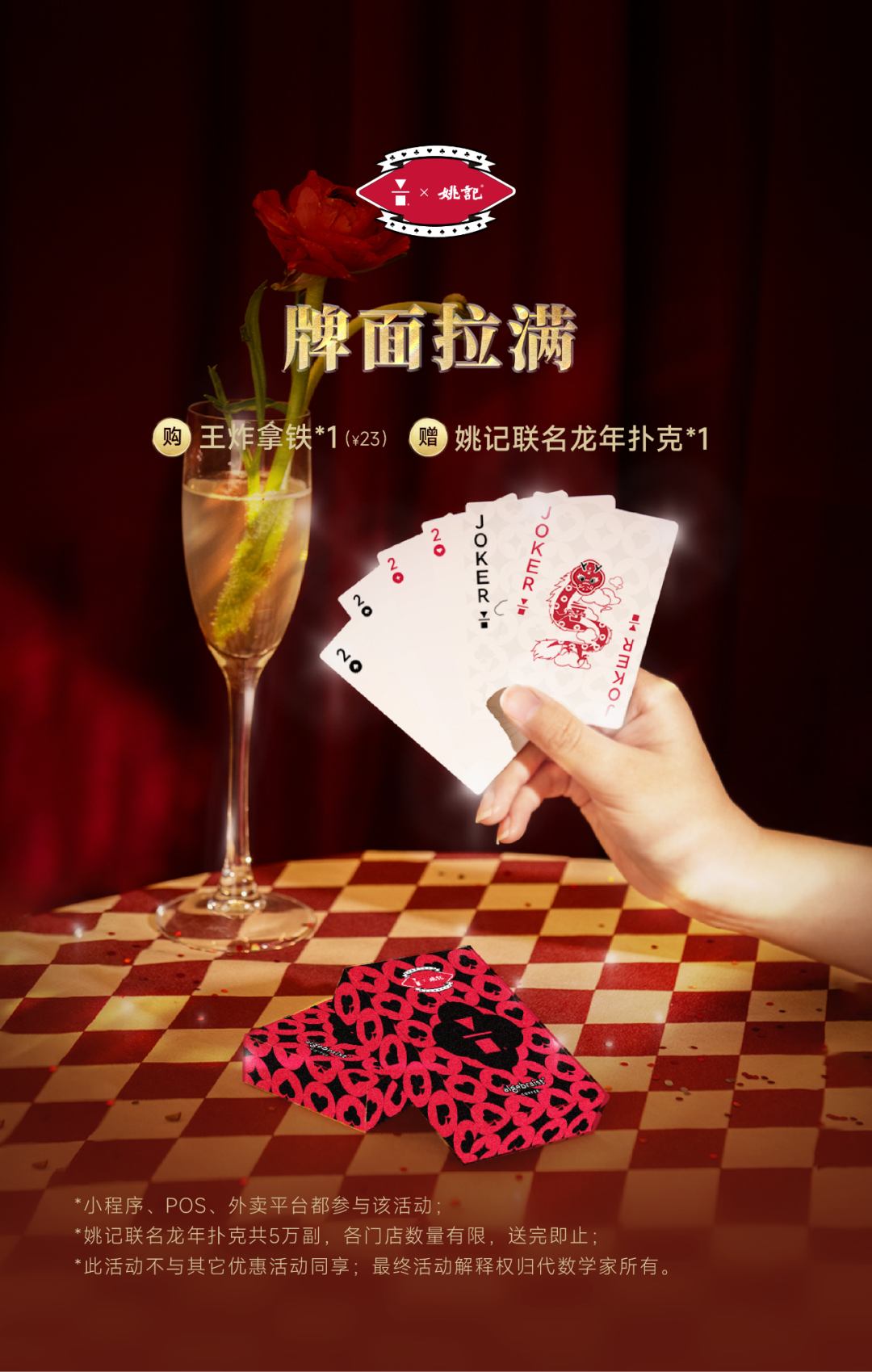 龙年将至,咖啡品牌代数学家和姚记合作推出王炸拿铁,购一杯23元的王炸拿铁,送一幅姚记联名龙年扑克,寓意“送你一幅龙年好牌。春节聚会,姚姚领先;组团掼蛋,齐乐龙龙”。