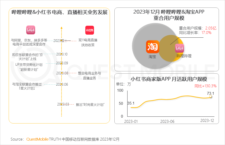 过去一年,内容平台与电商(生活服务)的相互跨界越来越迅猛:一边是内容平台纷纷搞起了电商和生活服务,抖音、快手在电商领域高歌猛进;2023年12月,哔哩哔哩与淘宝APP重合用户规模提升17.0%;小红书商家版APP月活跃用户规模较去年同期提升130.3%。