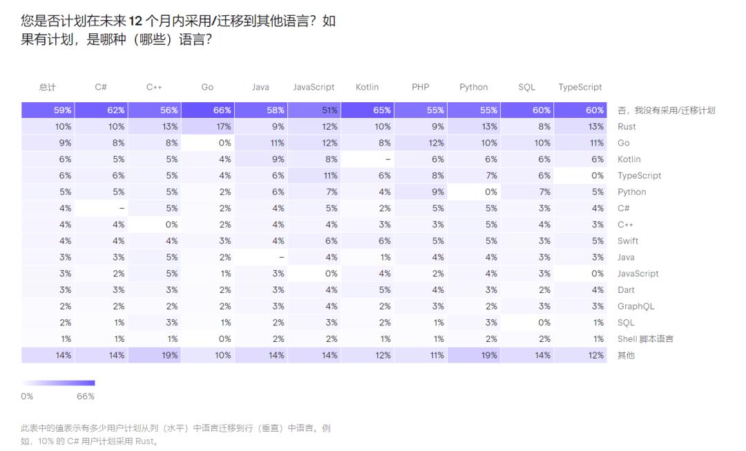 JetBrain 发布的 《2023 开发者生态系统现状》调研报告也证明了 Rust 的持续加速“出圈”:在今年最受欢迎的编程语言中,Rust 创造了新的使用记录,其用户群在过去五年中稳步增长,有望凭借其严格的安全性和内存所有权机制取代 C++;此外,Rust 今年首次取代 Go 成为希望迁移到其他语言的开发者的首选,而 Go 用户也是第一批准备采用 Rust 的人,JetBrains 数据表明,有六分之一的 Go 用户正在考虑采用 Rust。多年来,Rust 一直是最流行的学习语言之一 ,2023 年 Rust 首次占据榜首,即有最多开发者计划未来 12 个月内从原来使用的编程语言迁移到 Rust 编程语言。