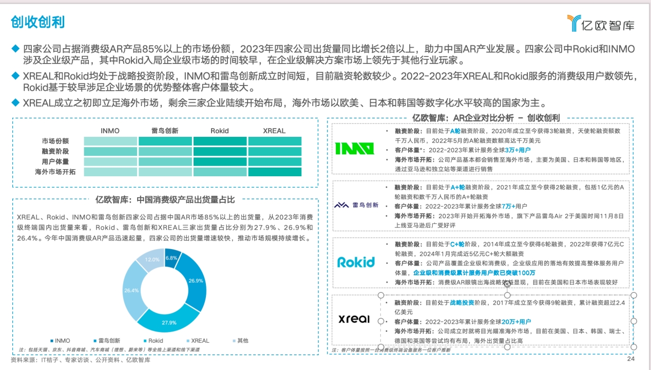 亿欧智库发布的《2024年中国AR产业发展洞察研究》显示,Rokid的累计服务客户数已经突破100万,2023年以27.9%的市场出货量占比,居国内消费级AR眼镜第一。