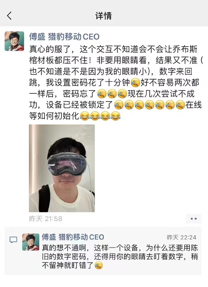 猎豹移动CEO傅盛在体验后也发朋友圈称,“这个交互不知道会不会让乔布斯棺材板都盖不住,非要用眼睛看,结果又不准,不知道是不是因为眼睛太小”......“用眼睛盯着数字,稍微不留神就弄错了”。