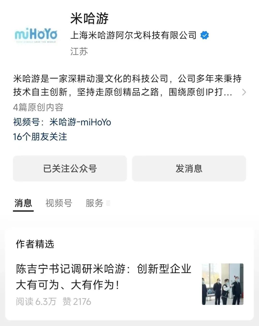 同时,上海领导近期也调研了米哈游,相关文章成为米哈游公众号的置顶。