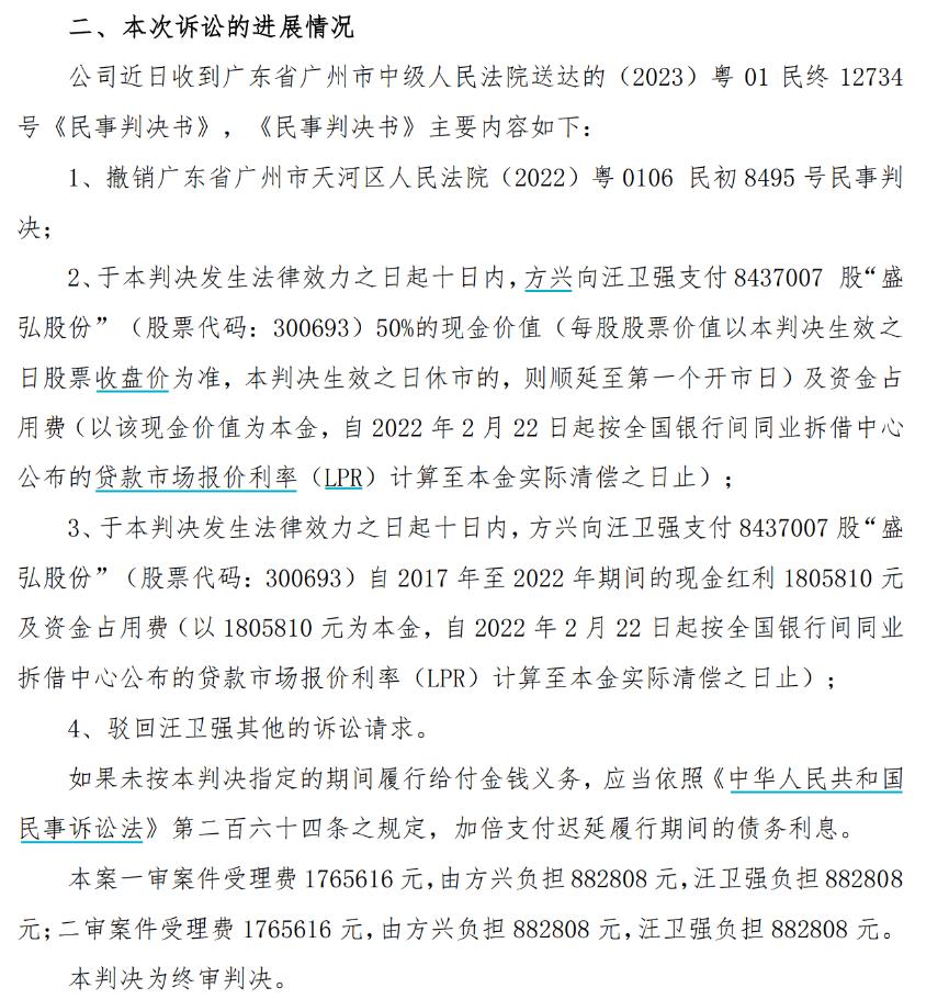 不过,在2024年2月2日晚间,盛弘股份一纸公告披露了终审结果:方兴将按50%的比例向汪卫强支付约843.7万股盛弘股份股票现金价值,以及2017年~2022年的现金红利及上述资金的资金占用费。