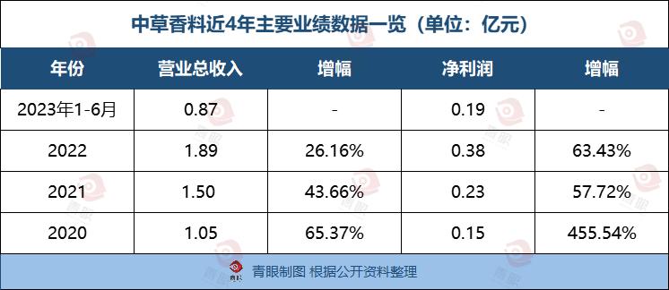 青眼梳理了中草香料近年来的主要财务数据,2020年至2023年上半年,中草香料营收分别为1.05亿元、1.50亿元、1.89亿元、0.87亿元;净利润分别为1463.05万元、2307.51万元、3771.25万元、1887.67万元;归母扣非净利润分别为1242万元、2402万元、3378万元、1564万元;毛利率分别为27.42%、32.35%、33.88%、34.16%。