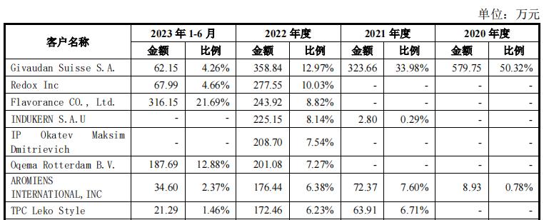 在产品销售方面,中草香料客户并不算集中,不存在严重依赖单个客户或少数客户的情况,且前5大客户销售金额占比也正逐年下降,2020年至2023年上半年,中草香料前5大客户销售金额占总销售额的比例分别为40.69%、36.54%、22.45%和22.21%。