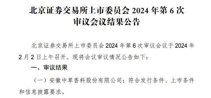 2月2日,青眼从北交所官网获悉,北交所上市委2024年第6次审议会议同意安徽中草香料股份有限公司(以下简称“中草香料”)公开发行股票的注册申请。这也意味着,中草香料或将成为2024年首个香料香精上市企业。