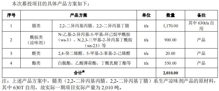 具体而言,该项目将生产包括腈类、凉味剂等多类产品,其中1170吨为腈类产品,而这也是凉味剂产品的主要原材料,因此其中630吨为自用,这也能够进一步帮助中草香料突破原料瓶颈,突破产业链限制,提升企业全产业链规模化生产能力。