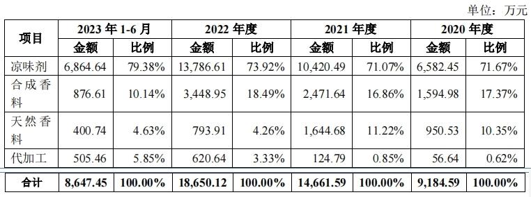 据招股书显示,中草香料的主要业务集中于凉味剂、合成香料和天然香料,其中凉味剂为其主营业务来源,主要囊括N,2,3-三甲基-2-异丙基丁酰胺(WS-23)、N-乙基-2-异丙基-5-甲基环已烷甲酰胺(WS-3)、凉味剂WS-10、乙酸薄荷酯等凉味剂系列产品,且相关原料已被列入《已使用化妆品原料目录(2021版)》中,被广泛应用于洗化、口腔、涂抹等日化领域。