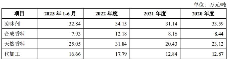 如合成香料价格在2022年就从8万元/吨的价格直升为12万元/吨,2023年上半年又降为7.93万元/吨,天然香料价格波动也较大;不过,凉味剂产品近年来价格较为稳定,售价维持在31.14-33.59万元/吨。