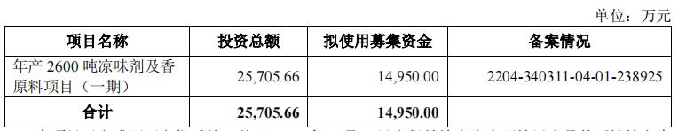 根据招股书,中草香料此次拟发行不超过1495万股人民币普通股,占发行后总股本的20.00%,扣除发行费用后全部用于公司主营业务相关的项目,即年产2600吨凉味剂及香原料项目(一期),拟使用募集资金为1.495亿元,项目总投资金额将达2.57亿元。目前,该项目已完成环评审批手续。