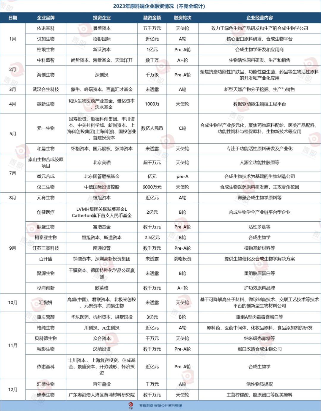 事实上,随着化妆品的功效、配方等越来越受到消费者重视,原料端也逐渐成为资本的宠儿。不过,受资本关注的企业主营业务也存在明显偏向性,青眼梳理了2023年28起原料端融资发现,受资本青睐的基础原料企业仍占少数,香料香精企业占比为0,大部分获投企业主营业务均为研发难度相对较高的功效原料,其中半数企业都涉及合成生物或重组胶原蛋白领域。