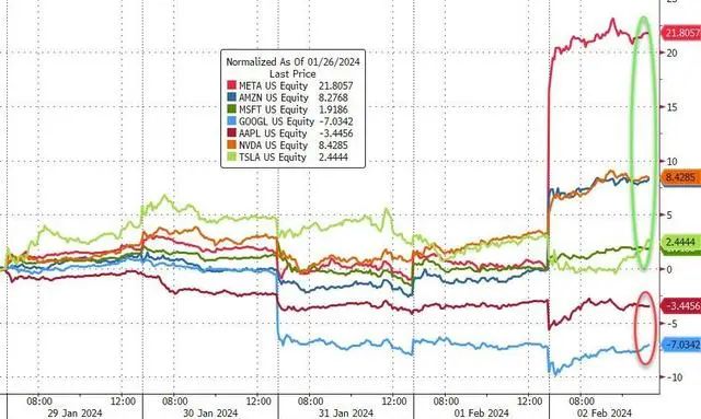 科技股“七姐妹” (苹果、微软、谷歌母公司alphabet、亚马逊、英伟达、特斯拉、Meta) 走势分化,美股要涨不动了吗?