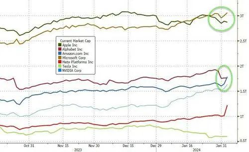 今年以来,科技股一路高歌,给美股贡献了大部分涨幅:数据显示,“七姐妹”贡献了1月份标普500指数回报的45%,目前该集团的市值达12.5万亿美元,超过了纽约和东京等主要城市的GDP。