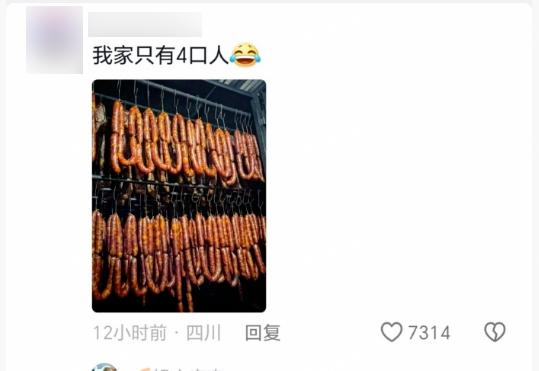 四川人:谁懂啊,去年的腊肉腊肠还没吃完躺在冰箱冷冻层,今年的已经又灌上熏上了,过年不管在哪家吃饭,饭桌上都是蒜薹炒腊肉、蒜苗炒腊肉、儿菜炒腊肠、蒸腊肉……连吃8天做梦都在被腊肉追杀。