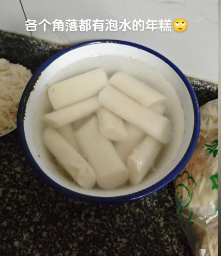 年糕这东西,一时吃不完,就只能用水泡着保鲜,过年期间温度够低,不至于变坏。养护也很简单,每天换水就行。